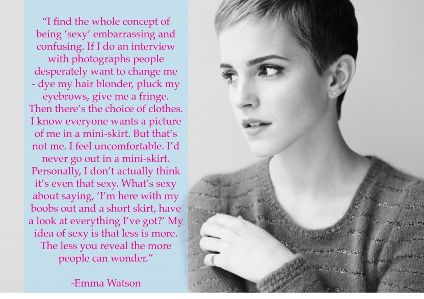 I came across this quote a while back from an interview with Emma Watson, the famous star from the Harry Potter films. I was really struck by her last statement that ‘less is more’. It reminds me of a former roommate of mine and a discussion we had revolving around the issue of buying a one piece bathing suit for an upcoming trip to the beach. “You gotta leave a little mystery!” were her words and how they have stuck with me. What does this have to say not only of our wardrobes, but maybe also to our lives lived online?