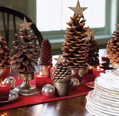 1) Pine comb Christmas trees: take a walk, gather, glitter, glue, stick in a votive holder or little jar, done.